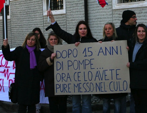 Nella foto, quando si dice parlar chiaro, gli rispondono le lavoratrici della Leader Pumps Group, che produce pompe idrauliche in Friuli: