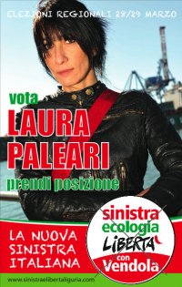Ora mi presento come candidata alle elezioni regionali LIGURIA 2010 nella lista di Sinistra Ecologia e Libertà – con Vendola: ho deciso di prestarmi alla politica dentro questo nuovo Partito perché propone un rinnovamento sociale ridando voce ai Movimenti, uno spiraglio di luce in un sistema politico ed economico in progressivo degrado e via via sempre più isolato dalla società civile.