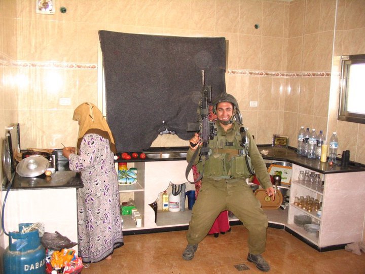Fully-armed IDF soldier preens for camera while Gazan mother attempts to ignore the humiliation of having her kitchen invaded