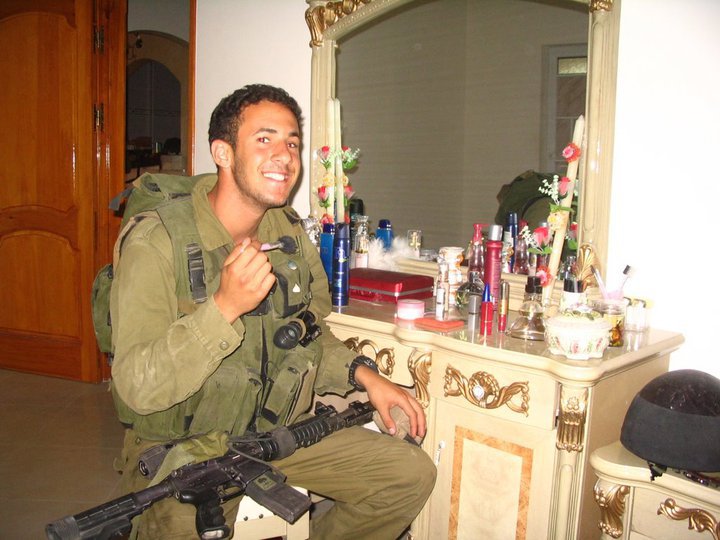 IDF soldier invades the bed chamber of Gaza family and appropriates woman’s personal make-up brush, preening for camera