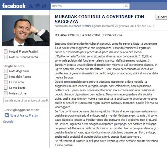 Dopo aver sostenuto fino all’ultimo il dittatore tunisino Ben Ali, il ministro degli Esteri Franco Frattini sulla sua pagina Facebook conferma ancora pieno appoggio a Mubarak.