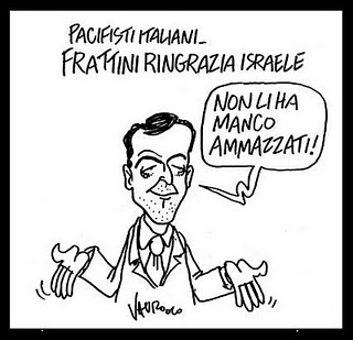 Una delle panzane più ridicole e marchiane di questo ‘ministro’ é stata: “Il governo israeliano ha sempre voluto la pace”. La pace risultante dallo sterminio? La pace che dà il nome a un deserto? Come può volere o anche solo essere interessato alla pace un Governo che dà carta bianca ai coloni Ebrei fondamentalisti di aggredire,massacrare, incendiare, vandalizzare, distruggere il popolo palestinese, le sue case, i suoi templi e i suoi assetti economici? Come può mirare alla pace un Governo che nella sua compagine include responsabili di odiose dichiarazioni razziste che paragonano i non-Ebrei (forse anche Frattini?) a somari e scimmie, a esseri non-umani??